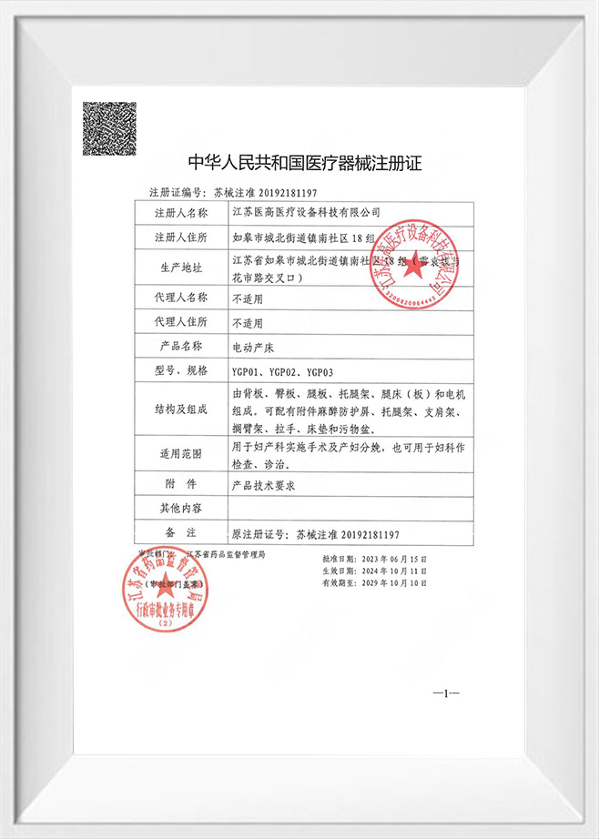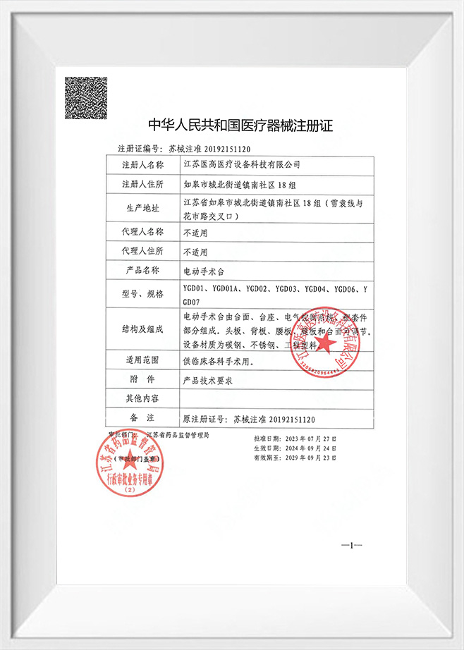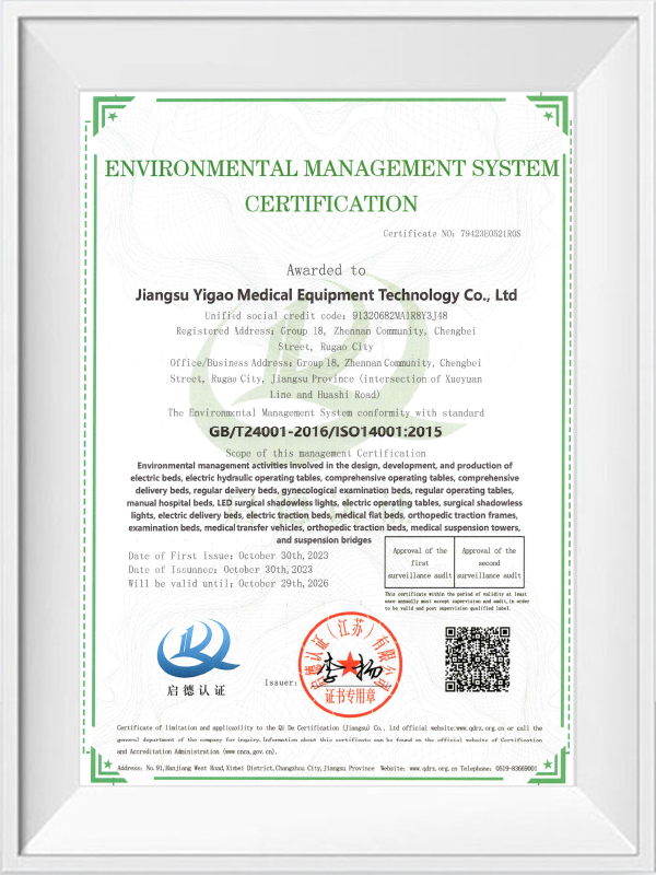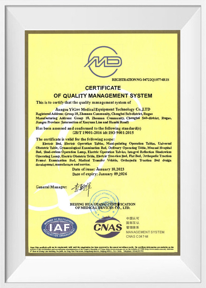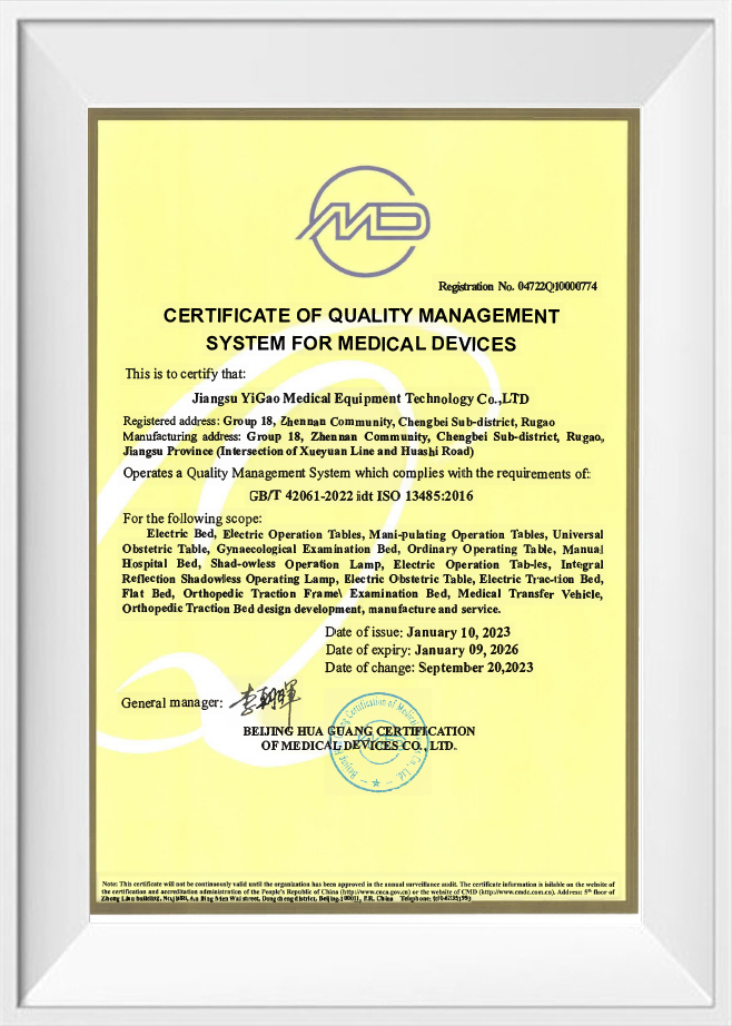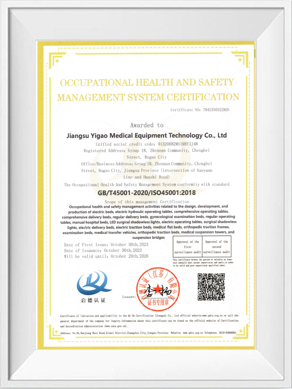 Ako podnik, ktorý prešiel ISO 9001, ISO 13485, ISO 14001, ISO 45001 a ďalšie certifikácie systému manažérstva, Jiangsu Yigao Medical Equipment Technology Co., Ltd. považuje kvalitu produktov za svoju životnú miazgu. Naše operačné stoly prísne dodržiavajú CE normy , čo znamená, že nielen spĺňajú bezpečnostné, zdravotné a environmentálne požiadavky európskeho trhu, ale predstavujú aj medzinárodnú vedúcu úroveň v dizajne a výrobe produktov.
