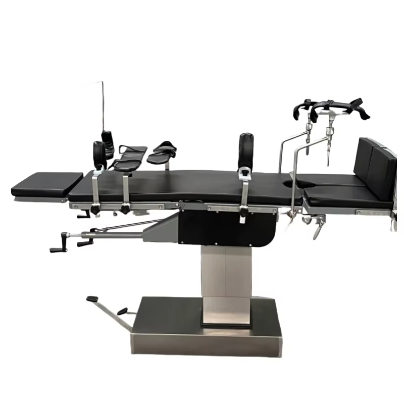 YGS3008B Multifunkčný hydraulický operačný stôl je vysokovýkonné medicínske zariadenie vhodné pre rôzne chirurgické operácie. Je široko používaný v oblasti hlavy a krku, hrudníka a brucha, perinea, končatín, ako aj v pôrodníctve, gynekológii, oftalmológii, otolaryngológii a ortopédii. Operačný stôl sa skladá z čela, chrbtovej dosky, bedier, bedier a delených nôh. Každý komponent je možné presne nastaviť. Sklápanie nahor a nadol, predné a zadné naklápanie, naklápanie vľavo a vpravo operadla a dosky nôh je možné ovládať ručne kľukovým prevodom, šnekovým prevodom a hrebeňovým systémom, aby sa zabezpečila stabilita a presnosť operácie. Hydraulický zdvíhací systém je poháňaný nožným hydraulickým čerpadlom, ktoré sa ľahko obsluhuje a je nehlučné a dokáže uspokojiť potreby častého nastavovania výšky. Operačný stôl má dosku z uhlíkovej ocele s povrchovou úpravou, ktorá je odolná voči korózii, je antioxidačná a ľahko sa čistí. Základňa a plášte stĺpov sú vyrobené z nehrdzavejúcej ocele, ktorá je odolná a stabilná.